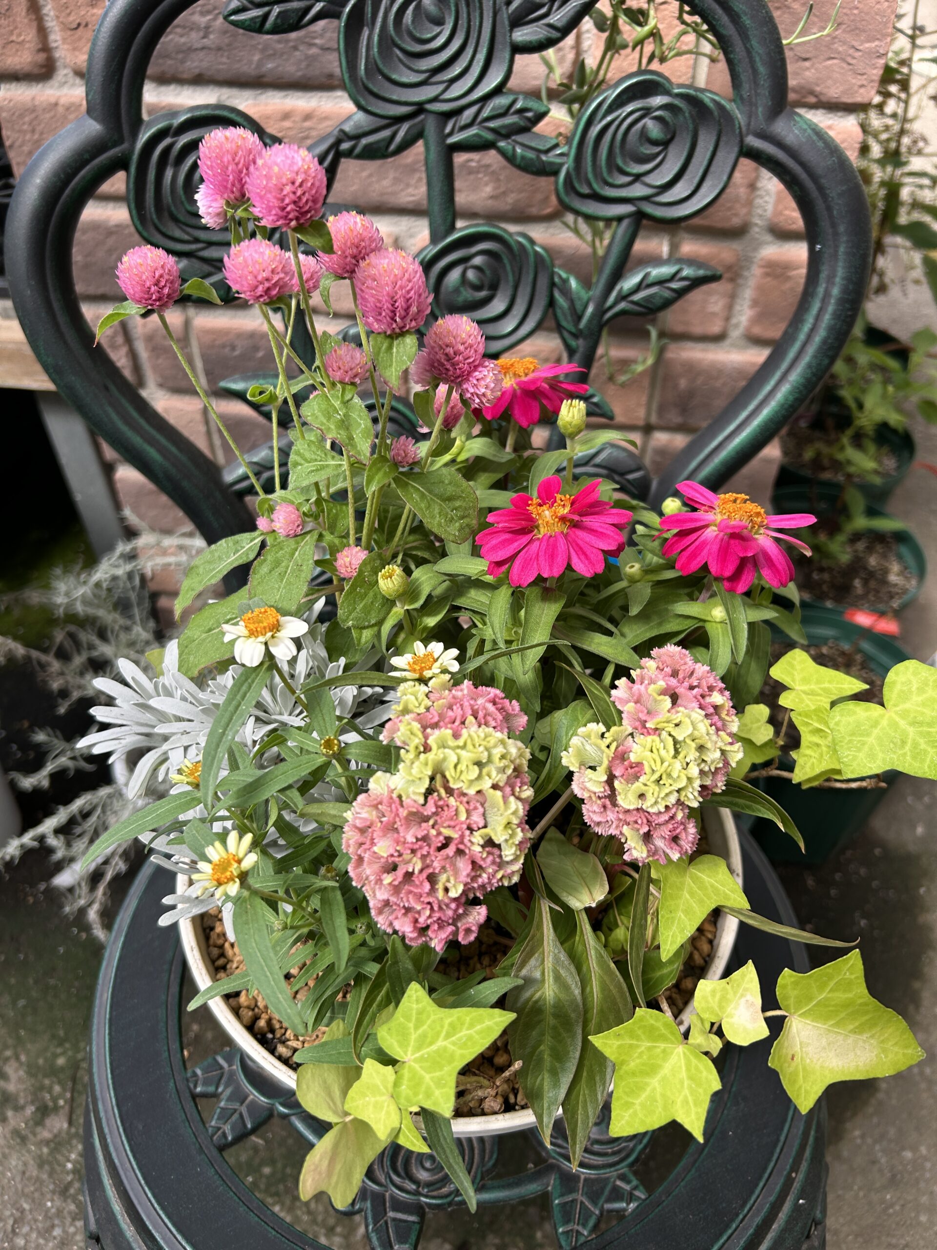 植えている植物:ケイトウ、ジニア、モクビャッコウ、センニチコウ、ヘデラ
